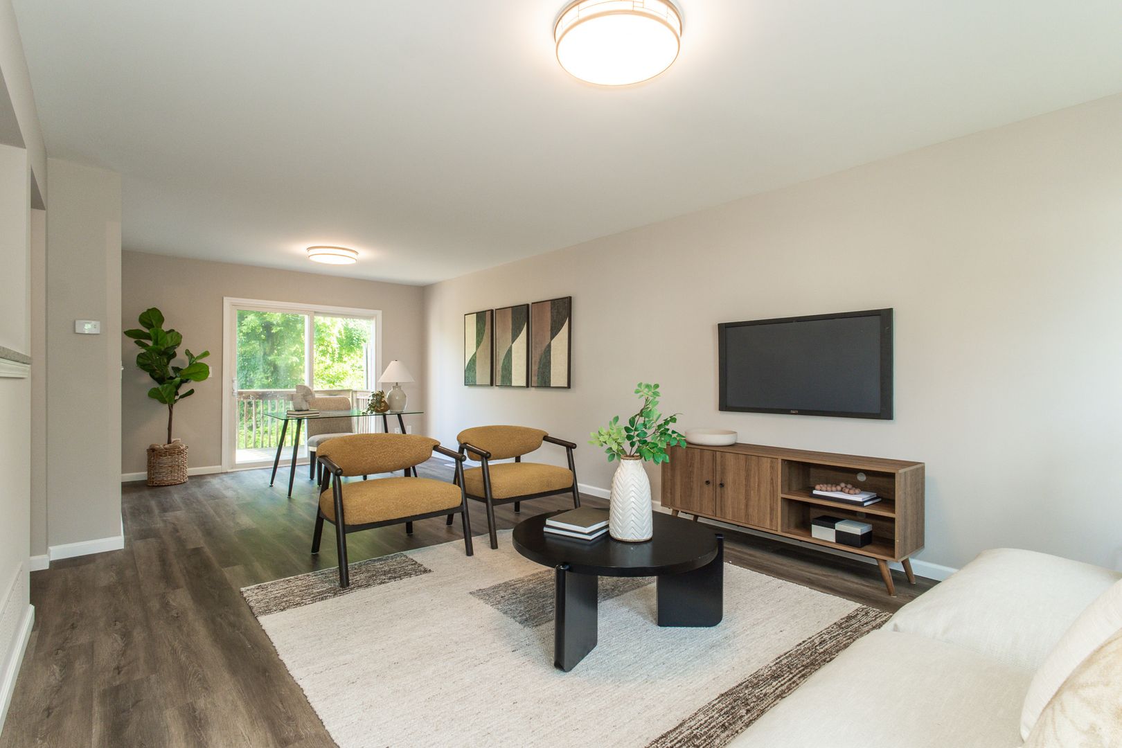 Bright open floor plan with a seamless flow from the brand-new eat-in kitchen & dining area to a large private deck—perfect for entertaining