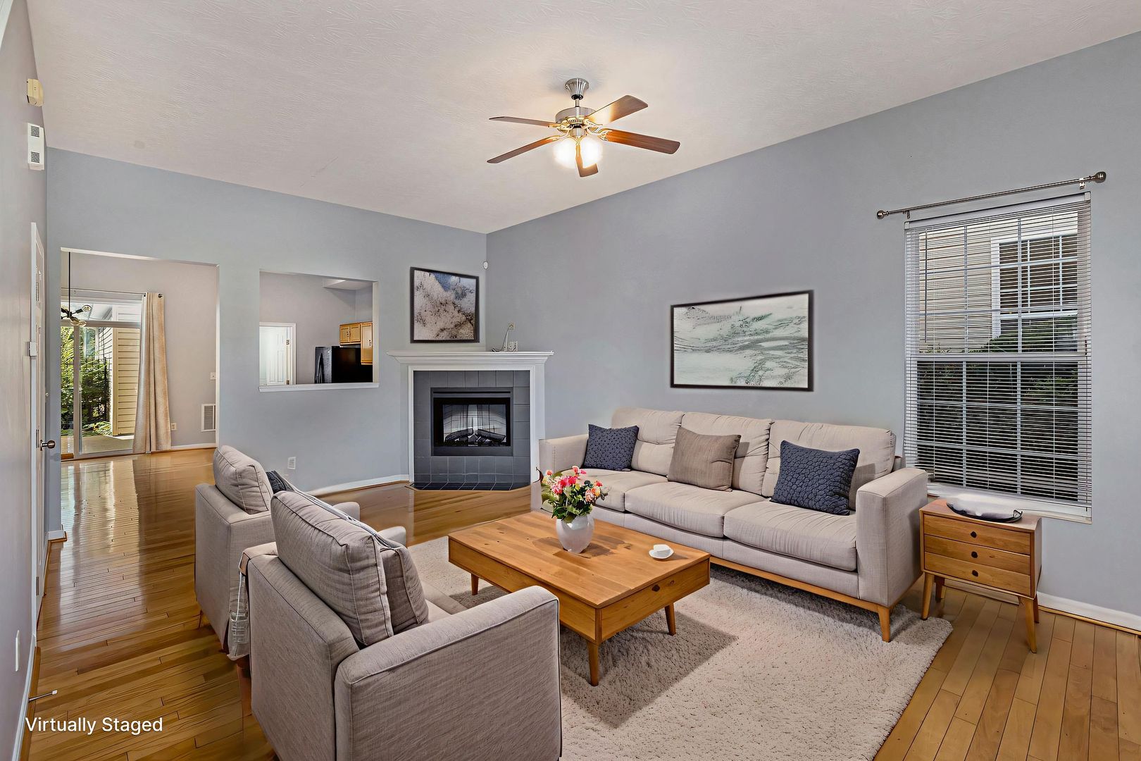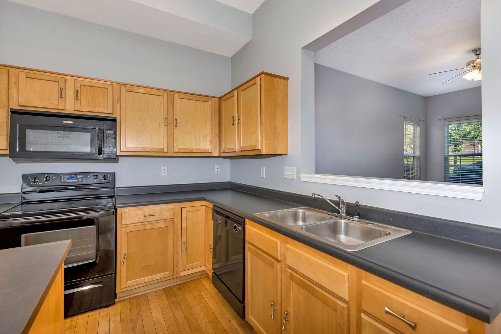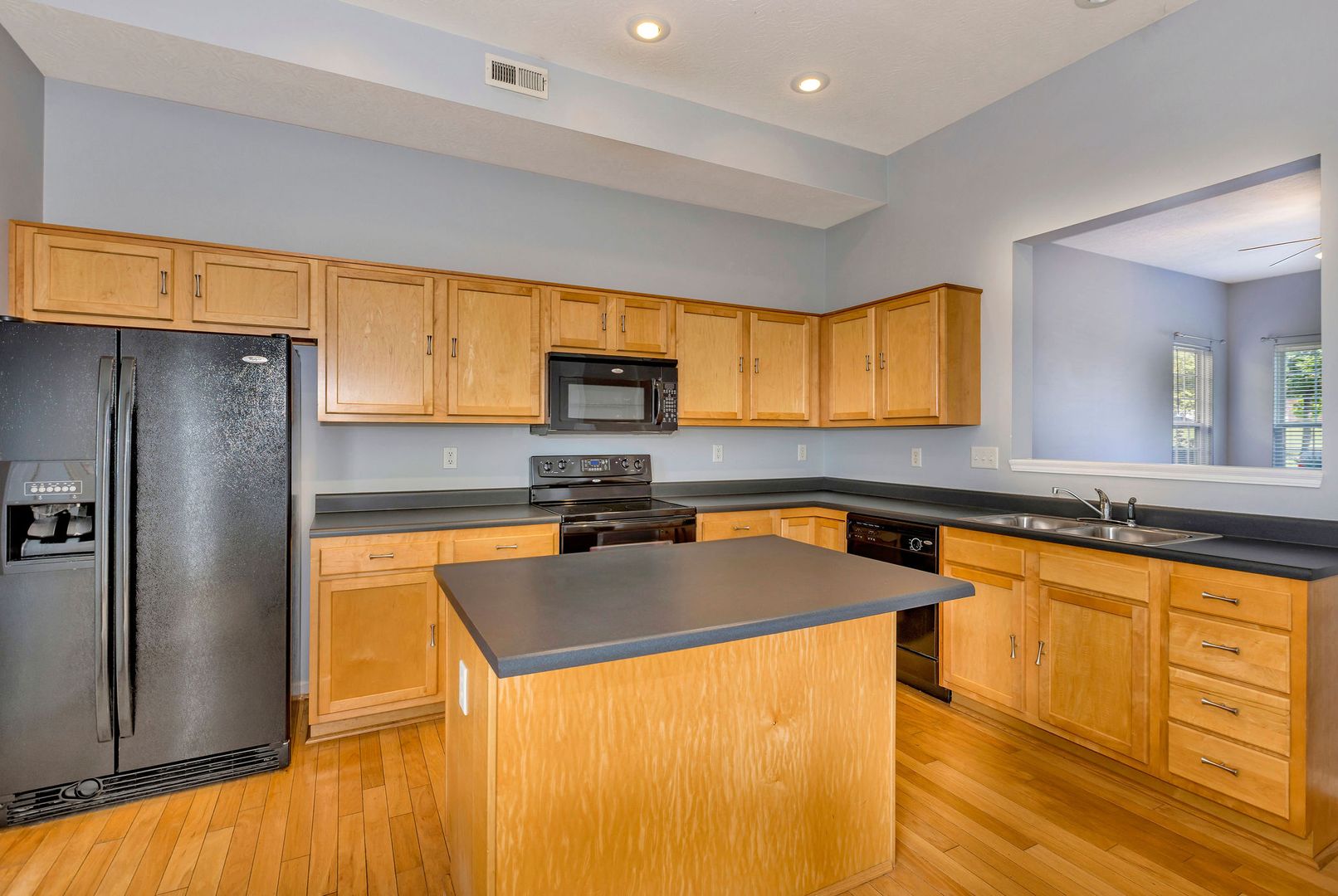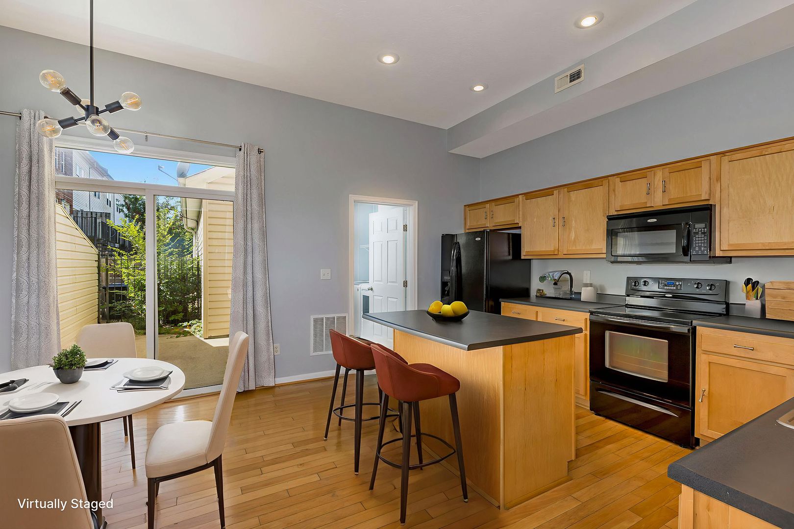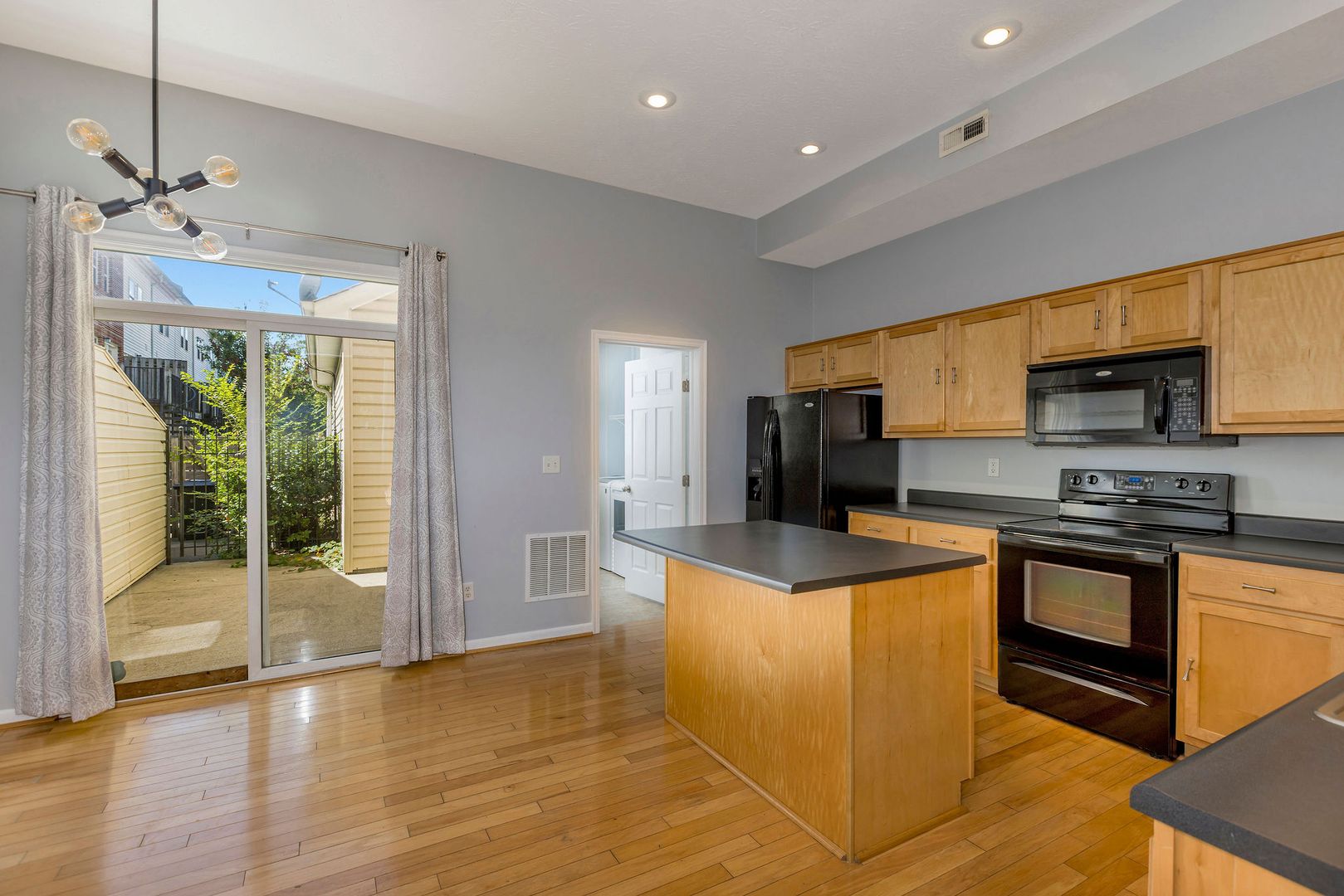 Bright and open floor plan with hardwood floors and a modern eat-in kitchen.